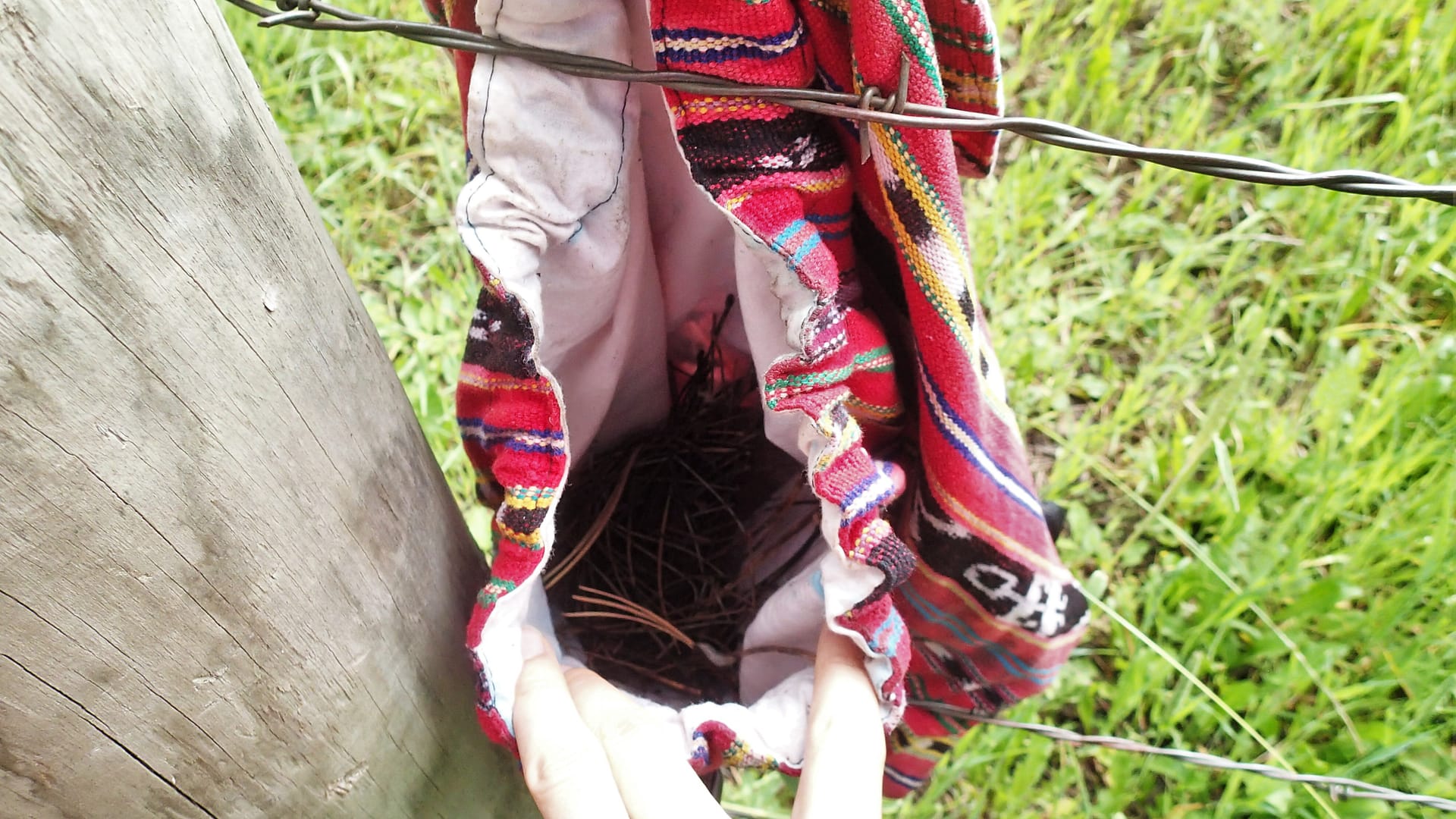 My field crewmates and I were camped in an open woodland on an old closed logging road. Each day, midsummer thunderstorms rolled through and left us soaking wet. With few other options, we hung items like wet socks to dry on a barbed wire fence. After my bright red, Belizean draw-string bag had been hanging out overnight, I noticed an increase in house wren activity near the fence. After watching the male disappear more than once with pine needles in his beak, I walked over to check my hanging bag on a hunch.